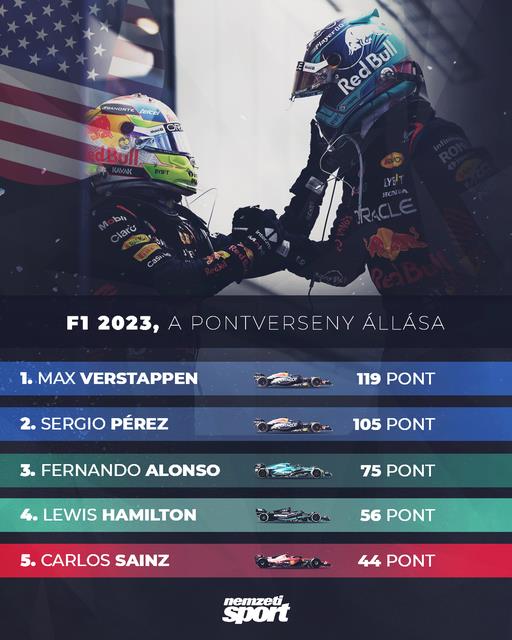 A két Red Bull továbbra is nagy előnnyel az élen, FernandoAlonsoOficial tartja a harmadik helyet, így áll az F1 pontversenye az ötödik futam után.