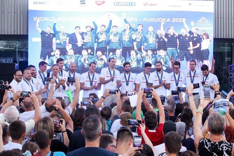 Így fogadták a szurkolók hétfő este a Duna Arénánál a világbajnokságot nyert férfi vízilabda-válogatott tagjait.