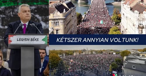 A Nyugati téri felüljáróról lelógva egy karton Magyar Péterrel bábozó Ursula von der Leyen köszönti a Békemenet résztvevőit.