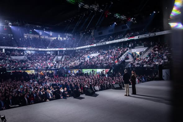 Dugig megtelt a Pick Aréna Szegeden, ahol az idei utolsó háborúellenes gyűlést tartják.