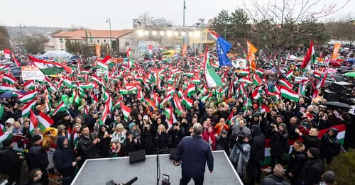 Zászlótenger és teltház a péceli Kossuth téren. Orbán Viktor megtöltötte Pécel legnagyobb terét is. #mandiner