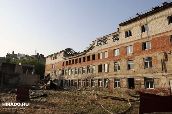 Romos épületek a kelet-ukrajnai Harkivban egy orosz dróntámadás után, 2025.július 11-én. Több ember megsebesült.