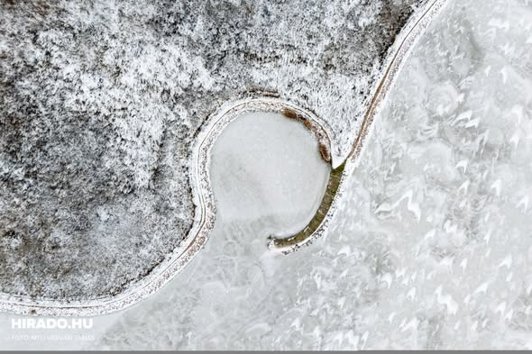 Drónfelvételen látható a jégpáncéllal borított a Velencei-tó Gárdonynál 2026. január 16-án. A tartós hideg hatására összefüggő jégréteg alakult ki, amelyen többen korcsolyáznak. A téli táj különleges…