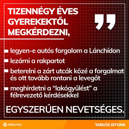 Tizennégy éves gyerekektől megkérdezni, legyen-e autós forgalom a Lánchídon, lezárni a rakpartot, beterelni a zárt utcák közé a forgalmat, és ott tovább rontani a levegőt, meghirdetni a „lakógyűlést”…