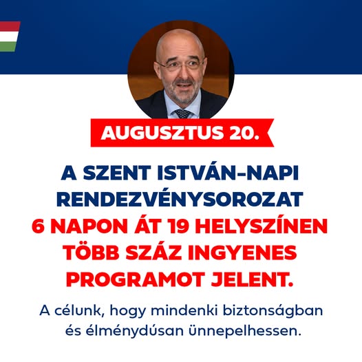 A Szent István-napi rendezvénysorozat augusztus 16-tól 21-ig tart. Továbbra is első a biztonság. Részletes program: https://szentistvannap.hu/