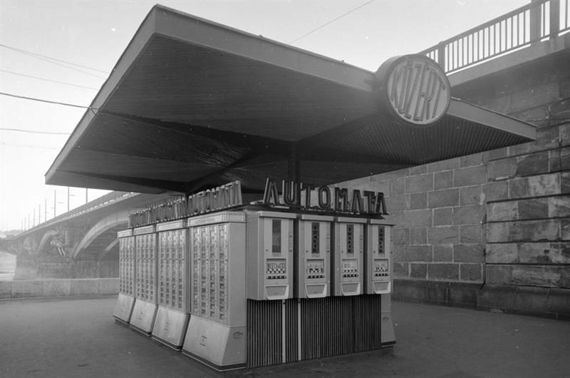 Ilyen is volt egykor: ételt és cigarettát lehetett venni a Margit híd budai hídfőjénél álló automatákból. A kép 1965-ben készült