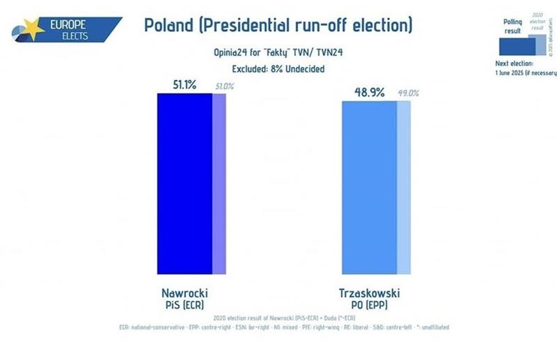 Egy héttel a lengyel elnökválasztás második fordulója előtt minimális előnnyel Karol Nawrocki, a jobboldali ellenzék jelöltje vezet egy friss felmérés szerint!