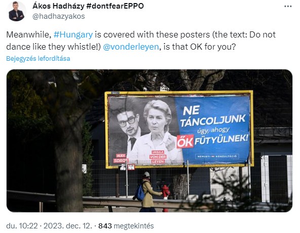 Hadházy Ákos a Twitteren (X-en) hisztizik a konzultációs plakátok miatt, és arról kérdezi Ursula von der Leyent, hogy neki ez rendben van-e?