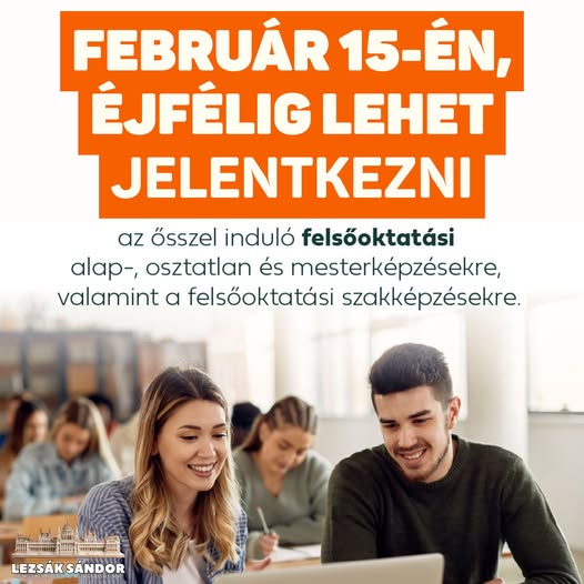 Február 15-én, éjfélig lehet jelentkezni az ősszel induló felsőoktatási alap-, osztatlan és mesterképzésekre, valamint felsőoktatási szakképzésekre.