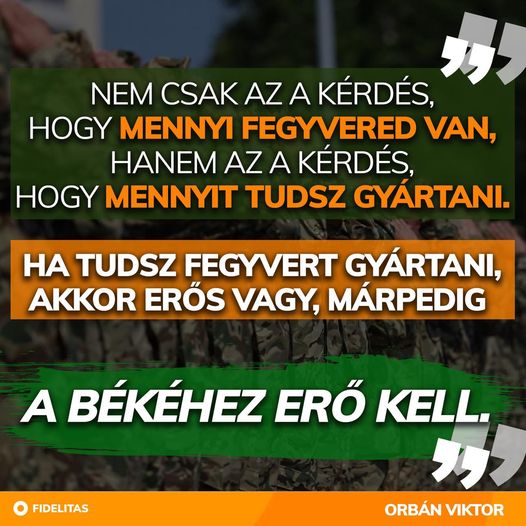 ️ Nemcsak az a kérdés, hogy mennyi fegyvered van, hanem az a kérdés, hogy mennyit tudsz gyártani. Ha tudsz fegyvert gyártani, akkor erős vagy, márpedig a békéhez erő kell. - Orbán Viktor