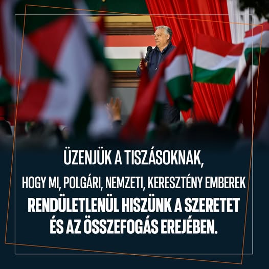 Orbán Viktor: mi rendületlenül hiszünk a szeretet és az összefogás erejében. És ezt mondjuk ma is a tiszásoknak, akik gyűlöletet hintenek mindenhol, és gyűlöletre akarnak politikát építeni, hogy mi,…