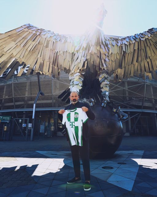 A Ferencváros frissen kinevezett vezetőedzője, Dejan Sztankovics a Groupama Aréna előtt a csapat mezével.
