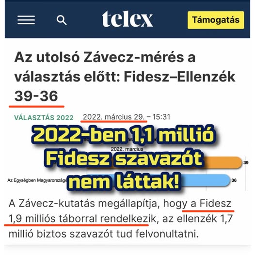 ️Hamarosan kijön a Závecz Research mérése az elsöprő Tisza-előnyről. Érdemes megnézni, mit mértek a 2022-es választás előtti utolsó mérésükben: 39 százalékos Fideszt, 1,9 millió szavazóval.