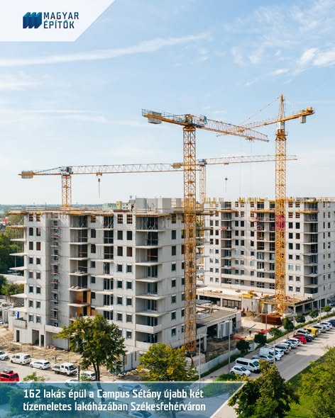 A fotózáskor a kilencedik emeleti falakon dolgozott a székesfehérvári Campus Sétány lakópark legújabb ütemének két épületén a MERKBAU.
