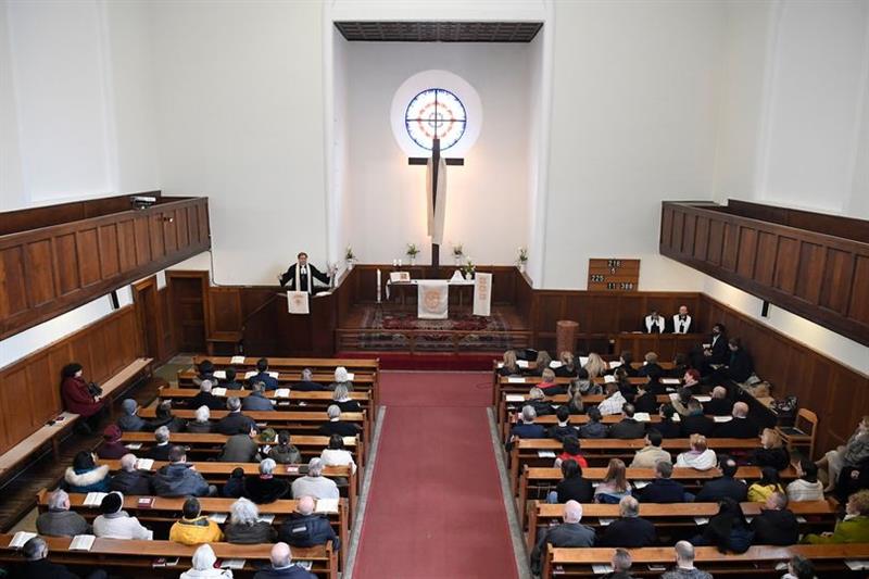 Fabiny Tamás, a Magyarországi Evangélikus Egyház elnök-püspöke igét hirdet a húsvétvasárnapi ünnepi istentiszteleten a budavári evangélikus templomban 2023. április 9-én.