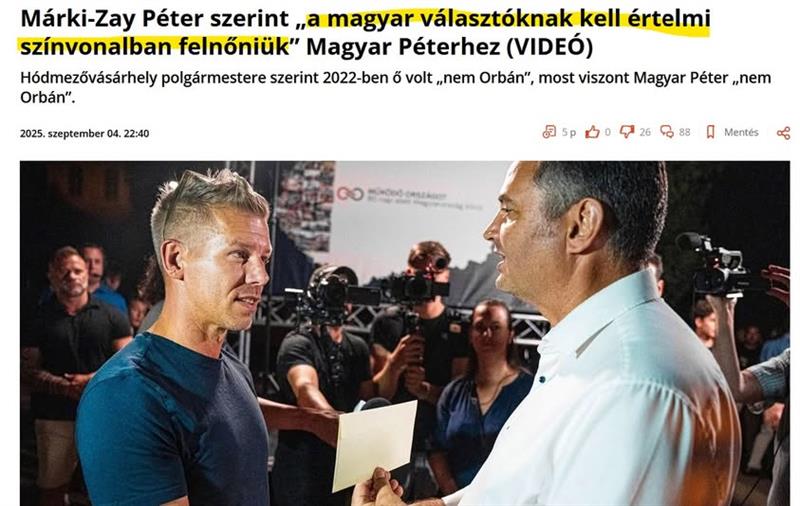 Márki-Zay már megint kijátszotta ápolóit és elszabadult: „Ahhoz, hogy ne legyen Magyarországon diktatúra, ahhoz most Magyar Péterre és a Tiszára kell szavazni. Ha őrá szavazunk, akkor demokrácia lesz, sokszínűség lesz, gazdagodás lesz, boldogság lesz, egészség lesz, VONAT lesz, minden lesz! Ha nem őt támogatjuk, akkor meg halál lesz.” Azt is mondta még a futóbolond, hogy: „gazemberek a Fidesz szavazói”, majd arról hadovált, hogy a magyaroknak intellektuálisan fel kell nőniük Magyar Péterhez...
