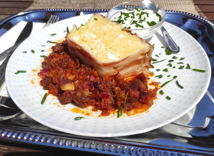 Maradt egy kis túrós csusza a mai ebédhez is, előjátéknak, lilahagymás csabai kulennel, snidlinges tejfellel.