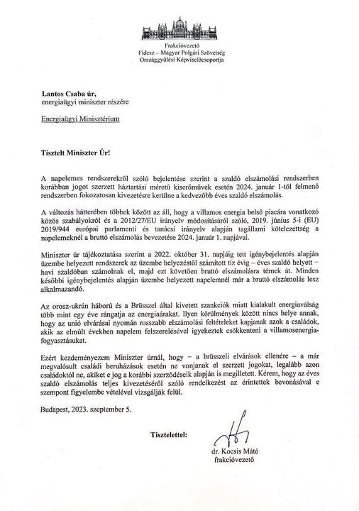 Levél Lantos Csaba energiaminiszternek 210 ezer magyar család érdekében, akik napelemmel csökkentik a fogyasztásukat