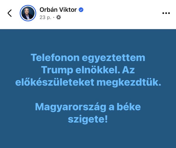"Az amerikai és az orosz elnök közötti találkozó hatalmas hír a békeszerető embereknek világszerte. Mi készen allunk!" - írta Orbán Viktor arra reagálva, hogy Trump elnök szerint Budapesten lehet a…