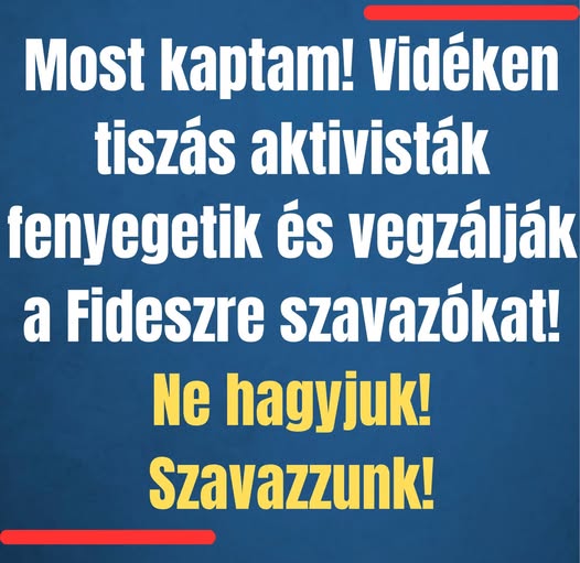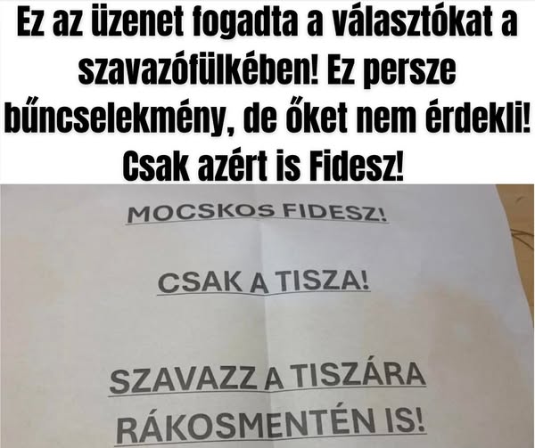Semmitől sem riadnak vissza! Bűncselekménytől sem! Megfélemlítik a választókat! Az ország több részén! Elég ebből! Elég a gyűlöletből és a Tiszából! Menj el, és szavazz te is a Fideszre! Csakazrétis!