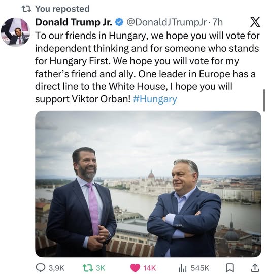 ️ Az X tele van támogató posztokkal. A Trump család teljes mellszélességgel a magyar miniszterelnök győzelmének drukkol!
