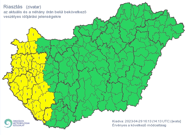 Az Országos Meteorológiai Szolgálat visszavonta a korábban zivatar veszélye miatt kiadott másodfokú riasztásokat, de az elsőfokú riasztások érvényben maradtak.