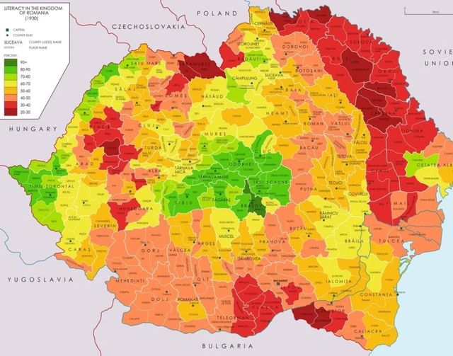 Írástudók aránya "nagy romániában, 1930-ban... (megj: zöld szín: 90% felett.)