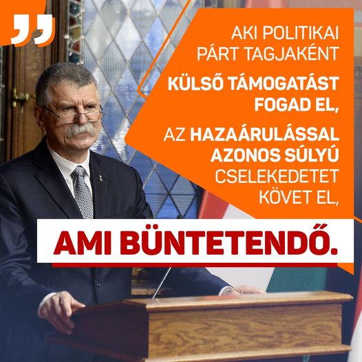 Kövér László: az a politikus, aki a hatalom megszerzéséért külföldi támogatást fogad el, az hazaárulással azonos súlyú cselekedetet követ el. Ami nemcsak erkölcsileg megvetendő, hanem büntetőjogilag…