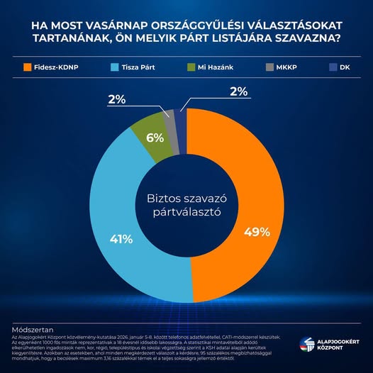 ️Vezet a Fidesz–KDNP a Tisza Párttal szemben. Az Alapjogokért Központ felmérése szerint a kormánypártokra 49%, a Tiszára 41% szavazna egy mostani választáson. Rajtuk kívül pedig csak a Mi Hazánk jutna…