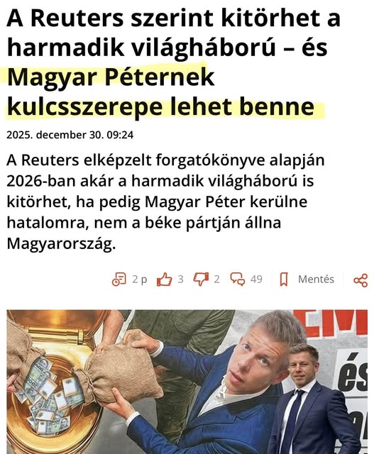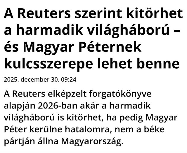 2026-ban elkezdődik a harmadik világháború, amelyhez nagy segítség, hogy Magyar Péter váltja a békepárti Orbán Viktort - ezt írja a brit Reuters hírügynökség. Elmebaj!!