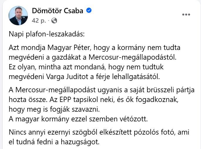 Manfred Weber világosan kijelentette: támogatják a Mercosur-megállapodást. A Tisza Párt pedig, a Néppárt tagjaként, ha akarna sem tehetne mást, követnie kell az EP-frakció által kijelölt irányt (ezt pedig Webertől és Tarr Zoltántól tudjuk). Magyar Péter egyébként akkor sem szólalt fel, amikor előterjesztették az EU költségvetését, amelyben 20%-kal csökkentenék az agrártámogatásokat. Szóval ennyit arról, hogy ő bármikor is a gazdák pártján állt volna!