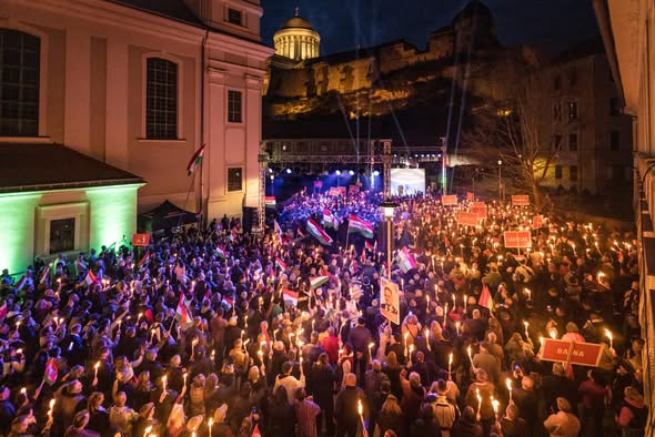 Orbán Viktor országjárása Esztergomban folytatódott, ahol ezrek vonultak fel a Békemeneten.