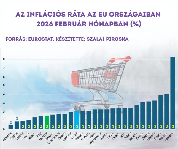 Az Eurostat legfrissebb adatai szerint februárban az infláció mindössze 1,6 százalék, ami a 7. legjobb eredmény az EU-ban