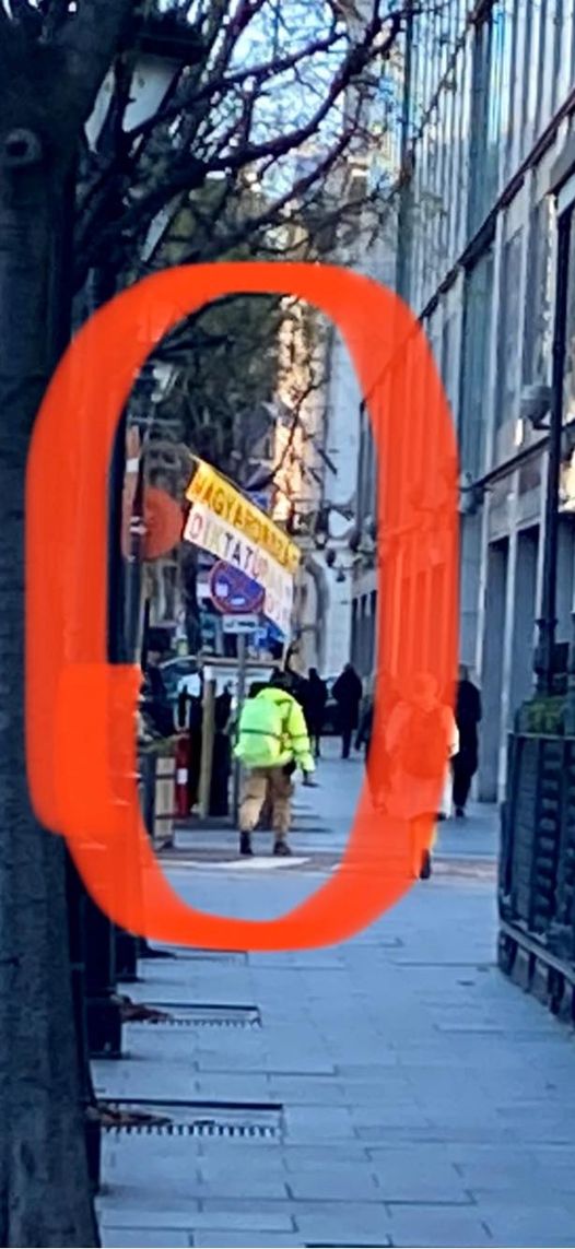 Ez az ember teljesen komolyan veszi a feladatát, szerda reggel a belvárosban láthatósági mellényben cipel egy több méteres zászlót, MAGYARORSZÁG DIKTATÚRA O1G felirattal.