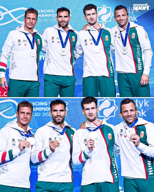 Megkapták világbajnoki ezüstérmeiket a magyar férfi kardcsapat tagjai (Iliász Nikolász, Szilágyi Áron, Rabb Krisztián és Gémesi Csanád). 🙏
