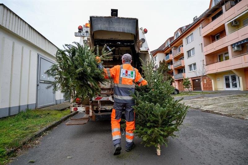 Zajlik a kidobott karácsonyfák begyűjtése Debrecenben.