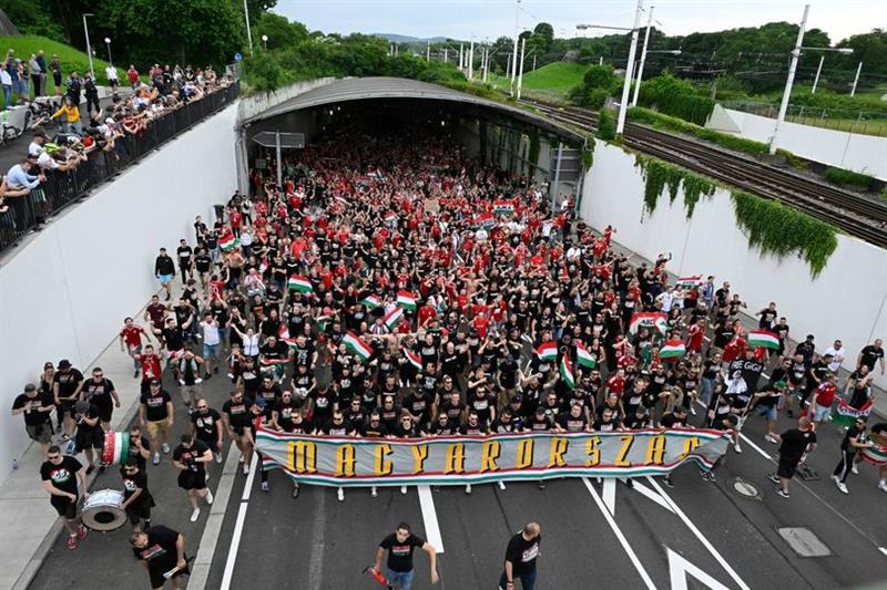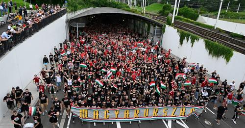 Magyar szurkolók vonulnak Stuttgartban 2024. június 23-án.