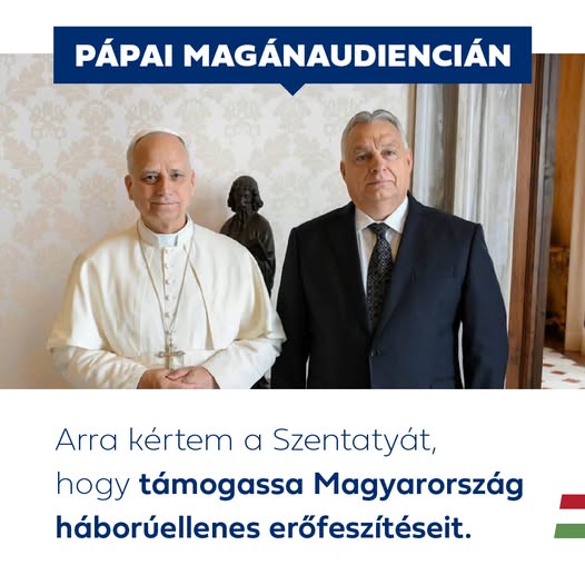 Orbán Viktor: ,,Van egy háborúellenes hálózat a világban, amelynek spirituális középpontjában a Szentatyát találjuk. Ma azt kértem Őszentsége XIV. Leó pápától, hogy a Vatikán továbbra is támogassa Magyarország háború elleni erőfeszítéseit."