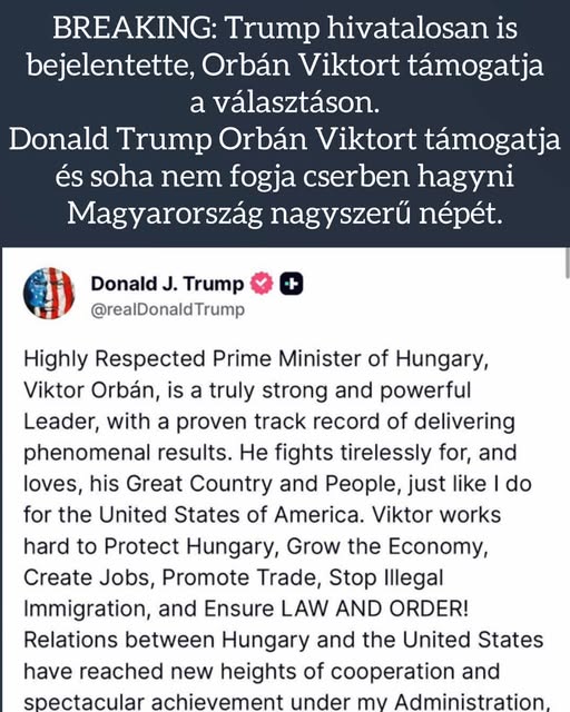 ️BREAKING! Donald Trump a közösségi oldalán jelentette be hivatalosan is, hogy Orbán Viktort támogatja az április 12-i választáson, szerinte is ő lesz a győztes! Itt az amerikai elnök teljes üzenete…