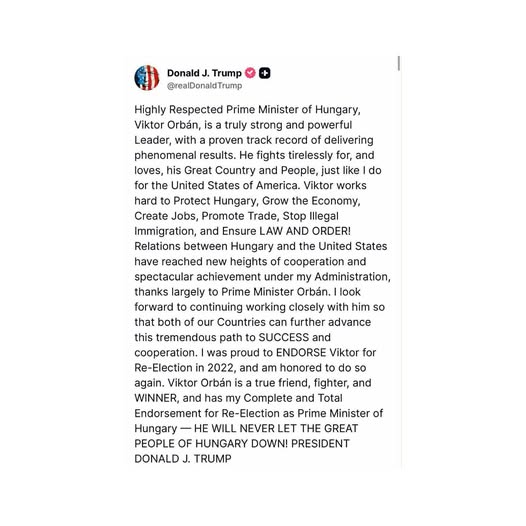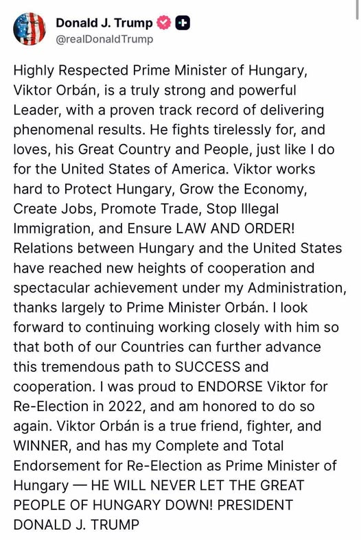 Trump Orbánt támogatja a választáson, és soha nem fogja cserben hagyni Magyarország nagyszerű népét. 💪🇭🇺🇺