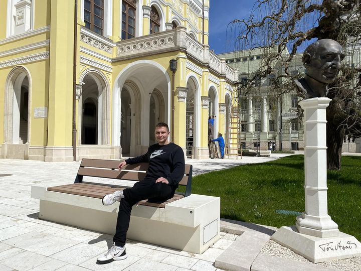 Mögöttem a vadiúj köntösbe bújtatott Csokonai Színház, mellettem a legendás Téri Arpád szobra, a kíváló színész, rendező 1950-57 között vezette a színházat, olyan ikonikus zsenik léptek fel itt…