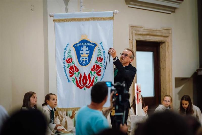 Tamási Zsolt, a most már jogi személyiséggel rendelkező marosvásárhelyi Római Katolikus Líceum igazgatója leveszi azt a fekete szalagot, amely akkor került a tanintézmény…