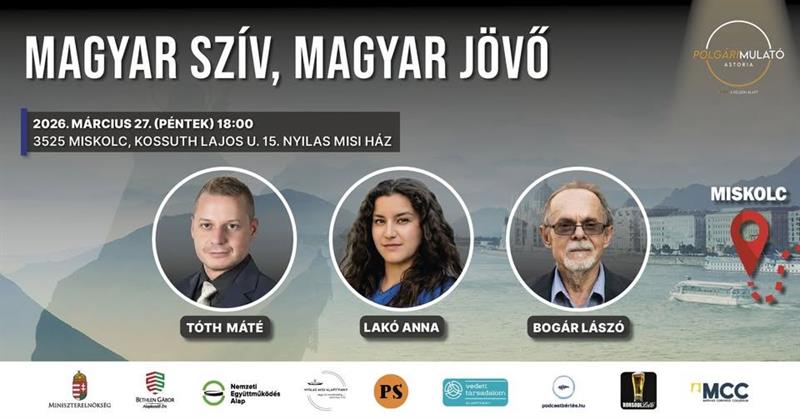MAGYAR Szív, Magyar Jövő címmel beszélgetés 2026. március 27. péntek, 18:00 órakor MISKOLC, Nyilas Misi Ház, Kossuth Lajos utca 15. szám. Előadók: BOGÁR LÁSZLÓ, Tóth Máté, Lakó Anna. A Polgári Mulató…